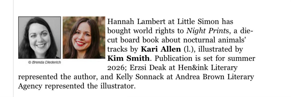 My next book was announced in PW. Keep your eyes out for Night Prints next summer. (2026) This is a companion book to Whose Prints? Summer 2026 can’t come fast enough.