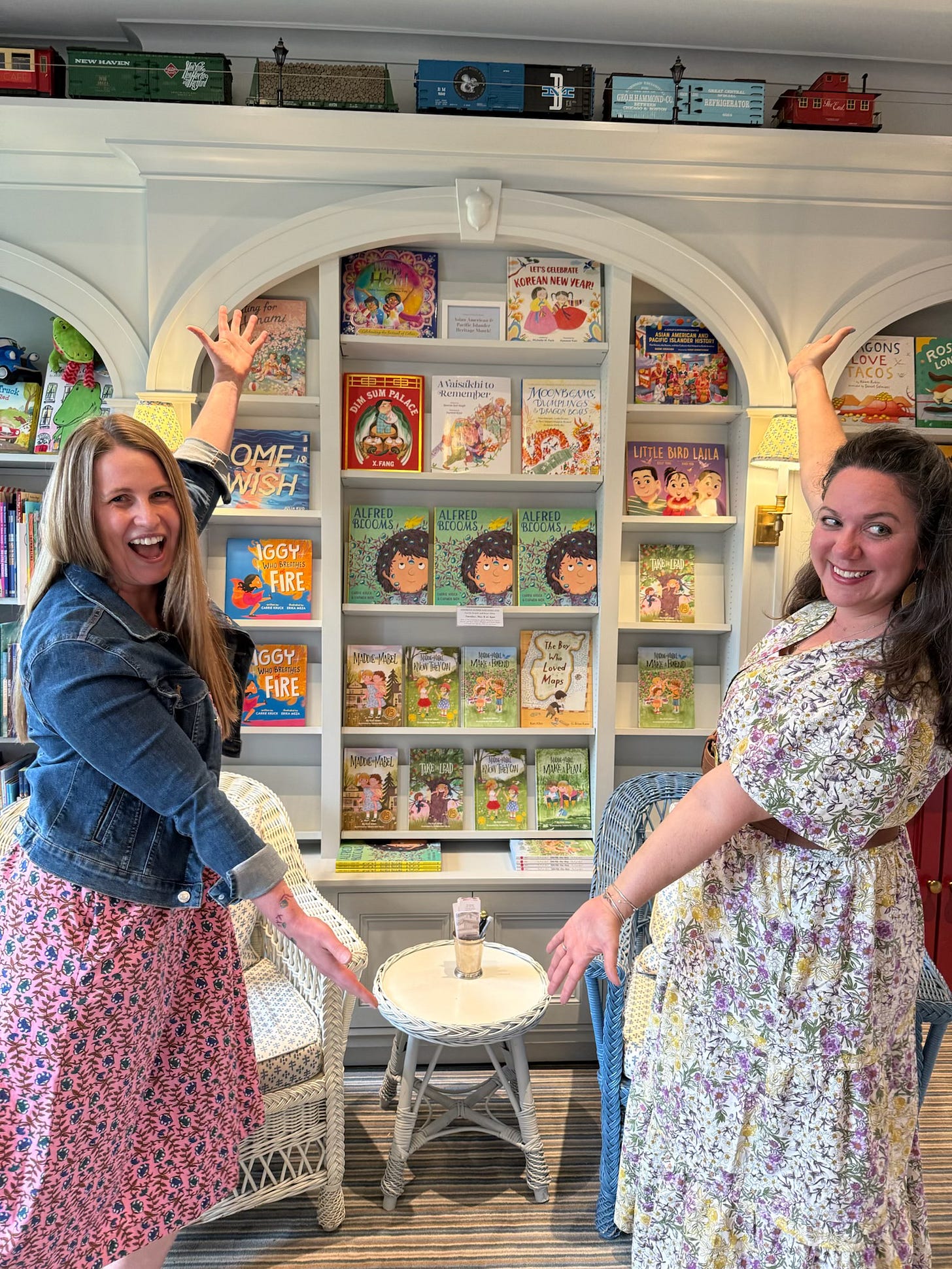 Maddie and Mabel Make a Friend launched on May 6th. What does a release day look like? Well…I took a half day off of school (the first time I have ever taken off any time on a launch day) and travelled down to Boston and Beacon Hill Books with fellow children’s author and my good friend Carrie Kruck on the first stop on our friendship tour. We both had books launching this spring and both were about friendship. In our brains, this meant we should do a mini-book tour together and so the Friendship Tour (now it’s uppercase) was born.